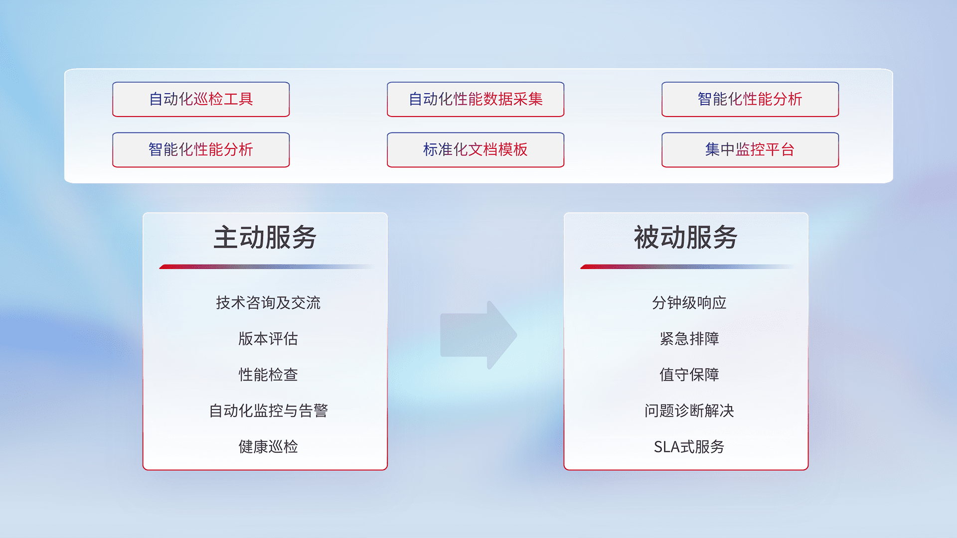 智能化工具和标准化文档,,,保障服务质量,,,,提供主动服务(包含技术咨询、、版本评估、、、、性能检查、、、、自动化监控与告警、、健康巡检)和被动服务包含(分钟级响应、、、紧急排障、、、、值守保障、、问题诊断解决、、、、SLA服务)。。。